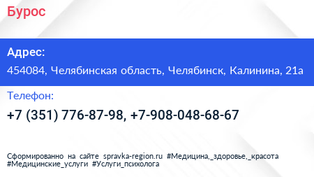 Для связи с организацией воспользуйтесь номером телефона: +7 (351) 776-87-98, +7-908-048-68-67. Пн: c 09:00-18:00, Вт: c 09:00-18:00, Ср: c 09:00-18:00, Чт: c 09:00-18:00, Пт: c 09:00-18:00, Сб: выходной, Вс: выходной, вы можете обратиться в эту организацию.