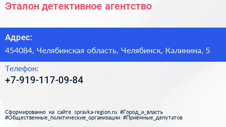 Эталон, детективное агентство по адресу 454084, Челябинская область, Челябинск, Калинина, 5 в дальнейшем Организация, размещена в следующих категориях: