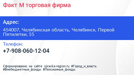 Факт-М, торговая фирма по адресу 454007, Челябинская область, Челябинск, Первой Пятилетки, 55 в дальнейшем Организация, размещена в следующих категориях: