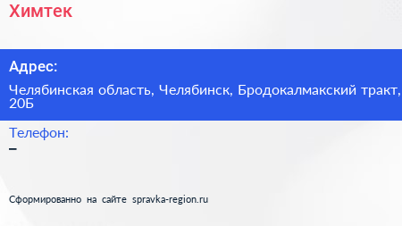 Химтек по адресу Челябинская область, Челябинск, Бродокалмакский тракт, 20Б в дальнейшем Организация, размещена в следующих категориях:
