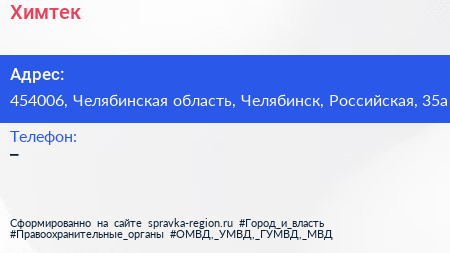 Химтек по адресу 454006, Челябинская область, Челябинск, Российская, 35а в дальнейшем Организация, размещена в следующих категориях: