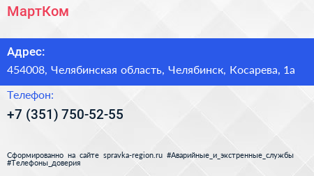 МартКом по адресу 454008, Челябинская область, Челябинск, Косарева, 1а в дальнейшем Организация, размещена в следующих категориях: