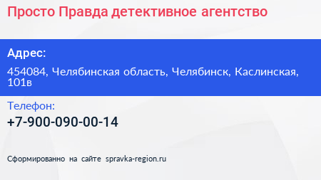 Просто Правда, детективное агентство по адресу 454084, Челябинская область, Челябинск, Каслинская, 101в в дальнейшем Организация, размещена в следующих категориях: