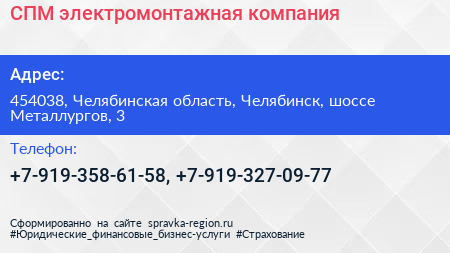 СПМ, электромонтажная компания по адресу 454038, Челябинская область, Челябинск, шоссе Металлургов, 3 в дальнейшем Организация, размещена в следующих категориях: