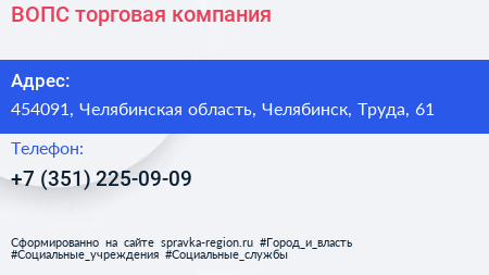 ВОПС, торговая компания по адресу 454091, Челябинская область, Челябинск, Труда, 61 в дальнейшем Организация, размещена в следующих категориях: