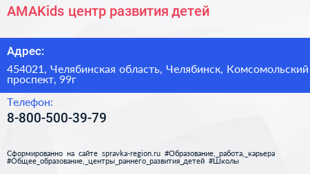 AMAKids, центр развития детей по адресу 454021, Челябинская область, Челябинск, Комсомольский проспект, 99г в дальнейшем Организация, размещена в следующих категориях: