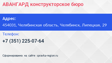 АВАНГАРД, конструкторское бюро по адресу 454031, Челябинская область, Челябинск, Липецкая, 29 в дальнейшем Организация, размещена в следующих категориях: