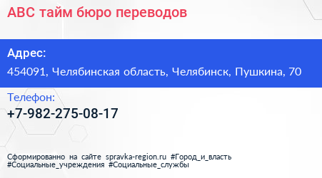АВС тайм, бюро переводов по адресу 454091, Челябинская область, Челябинск, Пушкина, 70 в дальнейшем Организация, размещена в следующих категориях: