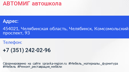 АВТОМИГ, автошкола по адресу 454021, Челябинская область, Челябинск, Комсомольский проспект, 93 в дальнейшем Организация, размещена в следующих категориях: