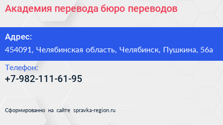 Академия перевода, бюро переводов по адресу 454091, Челябинская область, Челябинск, Пушкина, 56а в дальнейшем Организация, размещена в следующих категориях: