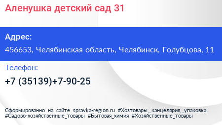Аленушка, детский сад №31 по адресу 456653, Челябинская область, Челябинск, Голубцова, 11 в дальнейшем Организация, размещена в следующих категориях: