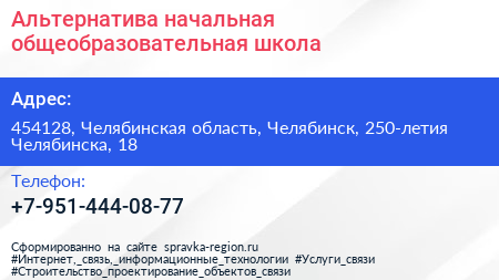 Альтернатива, начальная общеобразовательная школа по адресу 454128, Челябинская область, Челябинск, 250-летия Челябинска, 18 в дальнейшем Организация, размещена в следующих категориях: