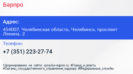 Барпро по адресу 454007, Челябинская область, Челябинск, проспект Ленина, 2 в дальнейшем Организация, размещена в следующих категориях: