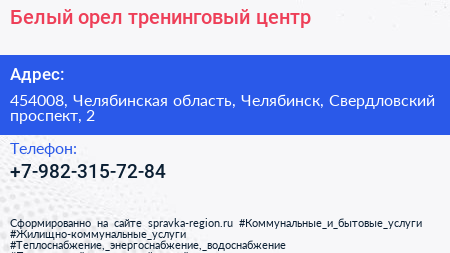 Белый орел, тренинговый центр по адресу 454008, Челябинская область, Челябинск, Свердловский проспект, 2 в дальнейшем Организация, размещена в следующих категориях: