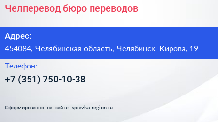 Челперевод, бюро переводов по адресу 454084, Челябинская область, Челябинск, Кирова, 19 в дальнейшем Организация, размещена в следующих категориях: