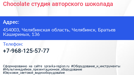 Chocolate, студия авторского шоколада по адресу 454003, Челябинская область, Челябинск, Братьев Кашириных, 136 в дальнейшем Организация, размещена в следующих категориях: