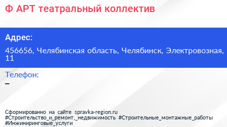 Ф-АРТ, театральный коллектив по адресу 456656, Челябинская область, Челябинск, Электровозная, 11 в дальнейшем Организация, размещена в следующих категориях: