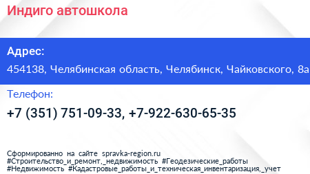 Индиго, автошкола по адресу 454138, Челябинская область, Челябинск, Чайковского, 8а в дальнейшем Организация, размещена в следующих категориях: