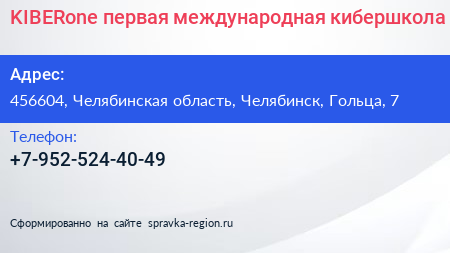 KIBERone, первая международная кибершкола по адресу 456604, Челябинская область, Челябинск, Гольца, 7 в дальнейшем Организация, размещена в следующих категориях: