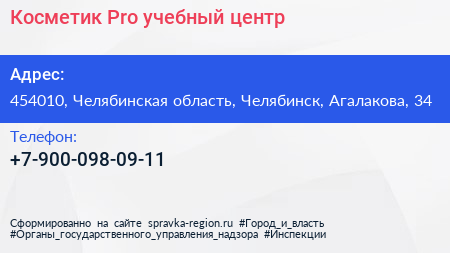 Косметик`Pro, учебный центр по адресу 454010, Челябинская область, Челябинск, Агалакова, 34 в дальнейшем Организация, размещена в следующих категориях: