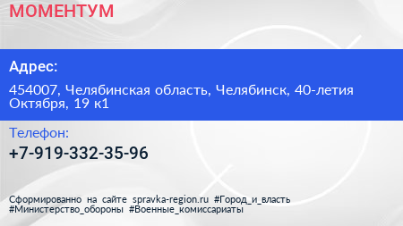 МОМЕНТУМ по адресу 454007, Челябинская область, Челябинск, 40-летия Октября, 19 к1 в дальнейшем Организация, размещена в следующих категориях: