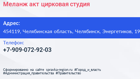 Меланж-акт, цирковая студия по адресу 454119, Челябинская область, Челябинск, Энергетиков, 19 в дальнейшем Организация, размещена в следующих категориях: