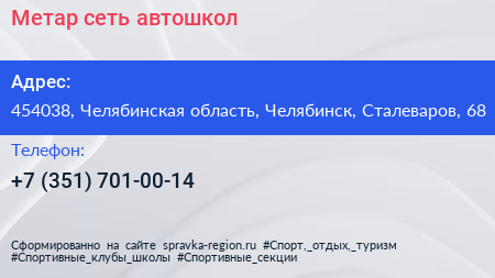 Метар, сеть автошкол по адресу 454038, Челябинская область, Челябинск, Сталеваров, 68 в дальнейшем Организация, размещена в следующих категориях: