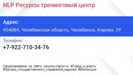 NLP-Ресурсы, тренинговый центр по адресу 454084, Челябинская область, Челябинск, Кирова, 19 в дальнейшем Организация, размещена в следующих категориях: