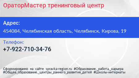 ОраторМастер, тренинговый центр по адресу 454084, Челябинская область, Челябинск, Кирова, 19 в дальнейшем Организация, размещена в следующих категориях: