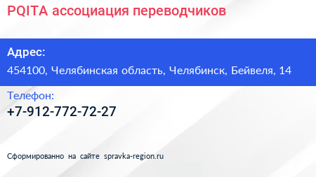 PQITA, ассоциация переводчиков по адресу 454100, Челябинская область, Челябинск, Бейвеля, 14 в дальнейшем Организация, размещена в следующих категориях: