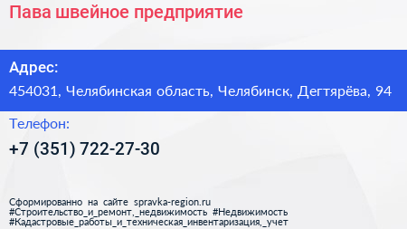 Пава, швейное предприятие по адресу 454031, Челябинская область, Челябинск, Дегтярёва, 94 в дальнейшем Организация, размещена в следующих категориях:
