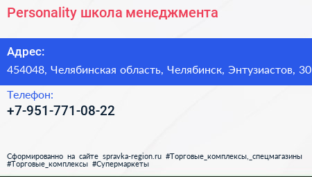 Personality, школа менеджмента по адресу 454048, Челябинская область, Челябинск, Энтузиастов, 30 в дальнейшем Организация, размещена в следующих категориях: