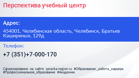 Перспектива, учебный центр по адресу 454001, Челябинская область, Челябинск, Братьев Кашириных, 129д в дальнейшем Организация, размещена в следующих категориях: