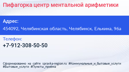 Пифагорка, центр ментальной арифметики по адресу 454092, Челябинская область, Челябинск, Елькина, 96а в дальнейшем Организация, размещена в следующих категориях:
