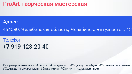 ProArt, творческая мастерская по адресу 454080, Челябинская область, Челябинск, Энтузиастов, 12 в дальнейшем Организация, размещена в следующих категориях: