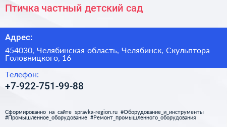 Птичка, частный детский сад по адресу 454030, Челябинская область, Челябинск, Скульптора Головницкого, 16 в дальнейшем Организация, размещена в следующих категориях: