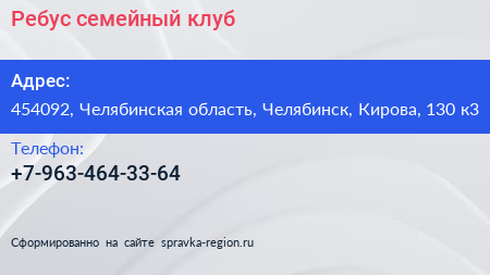 Ребус, семейный клуб по адресу 454092, Челябинская область, Челябинск, Кирова, 130 к3 в дальнейшем Организация, размещена в следующих категориях: