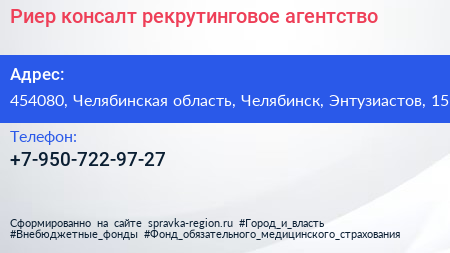Риер-консалт, рекрутинговое агентство по адресу 454080, Челябинская область, Челябинск, Энтузиастов, 15 в дальнейшем Организация, размещена в следующих категориях: