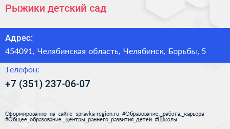 Рыжики, детский сад по адресу 454091, Челябинская область, Челябинск, Борьбы, 5 в дальнейшем Организация, размещена в следующих категориях: