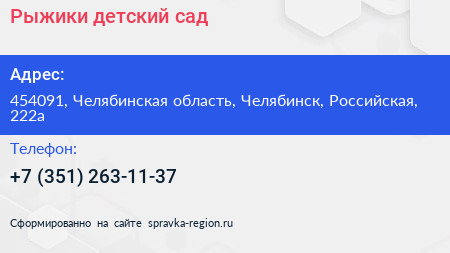 Рыжики, детский сад по адресу 454091, Челябинская область, Челябинск, Российская, 222а в дальнейшем Организация, размещена в следующих категориях: