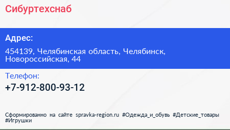 Сибуртехснаб по адресу 454139, Челябинская область, Челябинск, Новороссийская, 44 в дальнейшем Организация, размещена в следующих категориях: