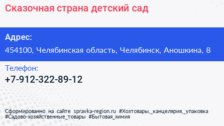 Сказочная страна, детский сад по адресу 454100, Челябинская область, Челябинск, Аношкина, 8 в дальнейшем Организация, размещена в следующих категориях: