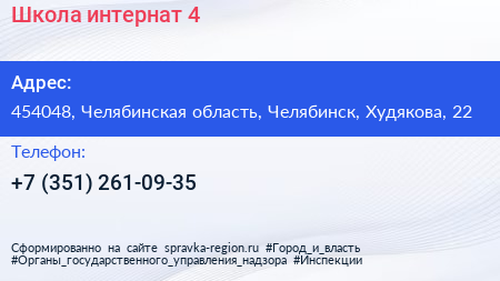 Школа-интернат №4 по адресу 454048, Челябинская область, Челябинск, Худякова, 22 в дальнейшем Организация, размещена в следующих категориях: