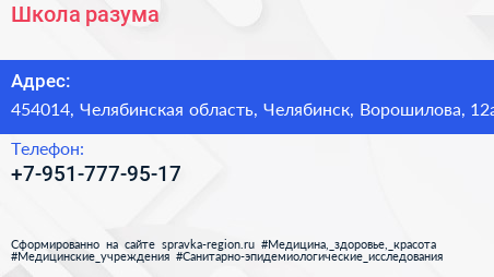 Школа разума по адресу 454014, Челябинская область, Челябинск, Ворошилова, 12а в дальнейшем Организация, размещена в следующих категориях:
