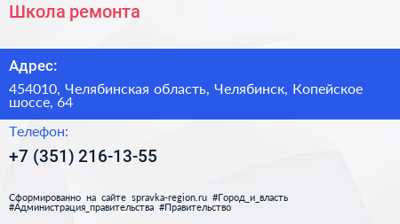 Школа ремонта по адресу 454010, Челябинская область, Челябинск, Копейское шоссе, 64 в дальнейшем Организация, размещена в следующих категориях: