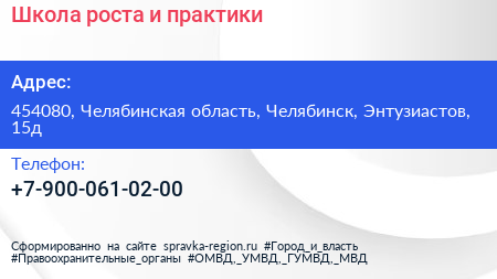 Школа роста и практики по адресу 454080, Челябинская область, Челябинск, Энтузиастов, 15д в дальнейшем Организация, размещена в следующих категориях: