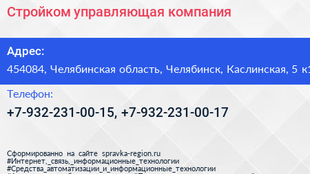 Стройком, управляющая компания по адресу 454084, Челябинская область, Челябинск, Каслинская, 5 к1 в дальнейшем Организация, размещена в следующих категориях: