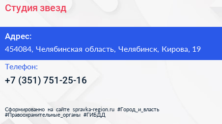 Студия звезд по адресу 454084, Челябинская область, Челябинск, Кирова, 19 в дальнейшем Организация, размещена в следующих категориях: