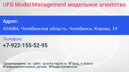 UFG Model Management, модельное агентство по адресу 454084, Челябинская область, Челябинск, Кирова, 19 в дальнейшем Организация, размещена в следующих категориях: