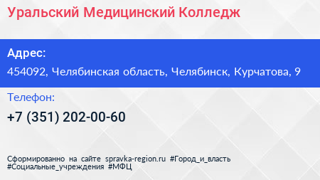 Уральский Медицинский Колледж по адресу 454092, Челябинская область, Челябинск, Курчатова, 9 в дальнейшем Организация, размещена в следующих категориях: